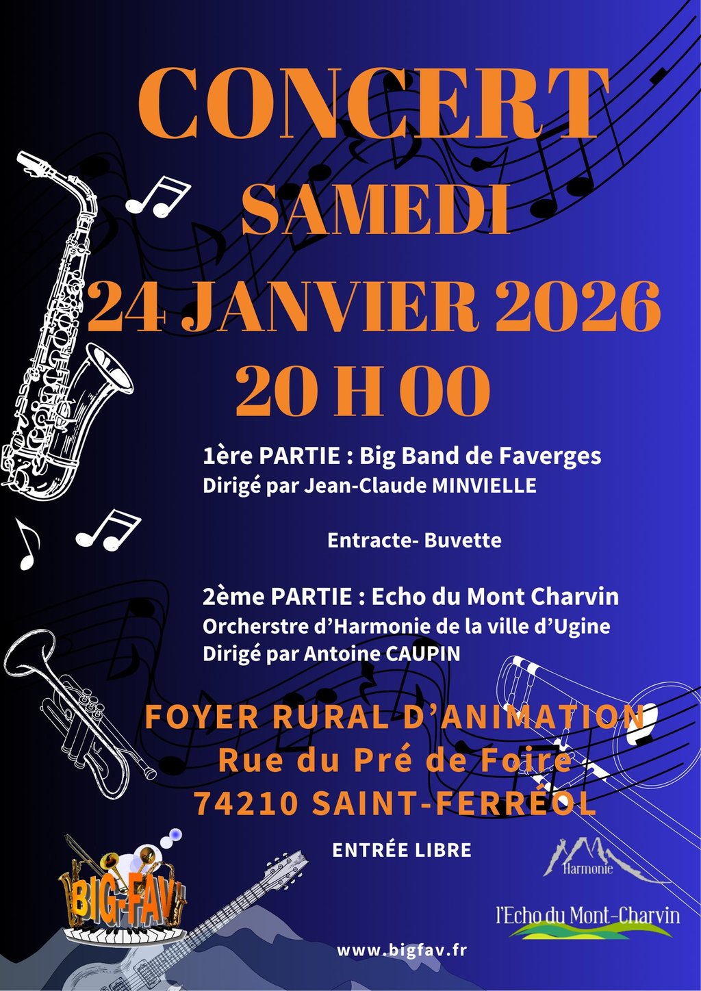 Concert en deux parties, au foyer rural à partir de 20h : Big Fav' puis Echo du Mont-Charvin.🎷🎵