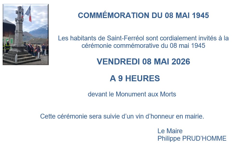 Les habitants de Saint-Ferréol sont cordialement invités à la cérémonie commémorative du 08 mai 1945
