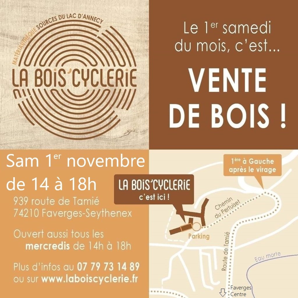 La Matériauthèque des Sources du Lac d'Annecy vous informe que ce Samedi 1er novembre 2025 de 14h à 18h, se tiendra une vente de bois à la BOIS'CYCLERIE située 939 route de Tamié (74210) FAVERGES - SEYTHENEX.