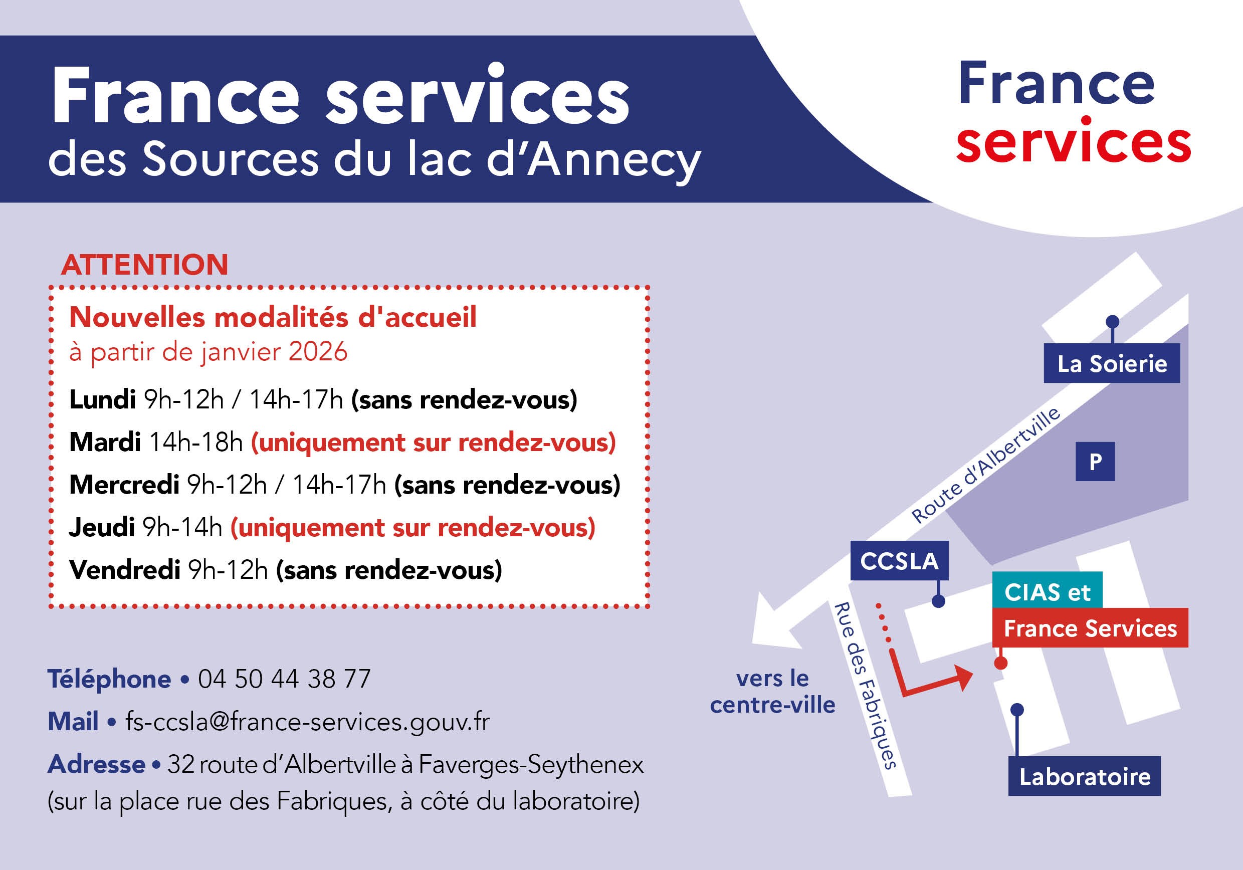 Afin de mieux s’adapter aux besoins des usagers, les modalités d’accueil de votre France services des Sources du lac d’Annecy changent à partir de janvier 2026.